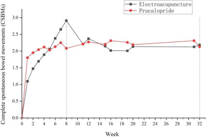 Figure 2. Évolution hebdomadaire des défécations complètes spontanées dans les groupes électroacupuncture et prucalopride sur l’ensemble de la période (Gao S et al., 2025)