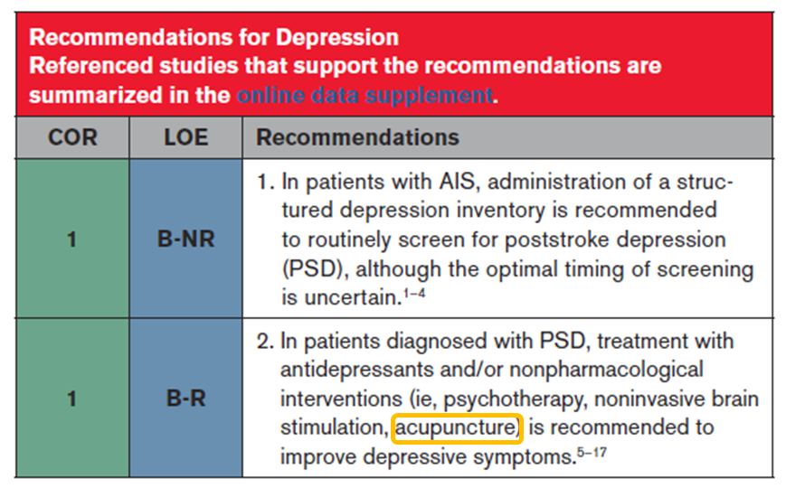 L'élément notable par rapport aux RBP de 2018 qui ne faisaient aucune mention de l'acupuncture, est l'apparition d'une recommandation positive de l'acupuncture dans la dépression post-AVC.