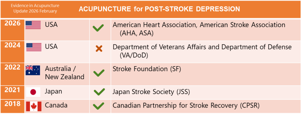 Sur cinq recommandations ayant évalué l’acupuncture dans la prise en charge de la dépression post-AVC [3], quatre (États-Unis, Australie–Nouvelle-Zélande, Japon, Canada) formulent une recommandation favorable, tandis qu’une seule (États-Unis, Veterans Affairs/Department of Defense) ne se prononce pas (ni pour ni contre), en raison d’un niveau de preuve jugé insuffisant [4].