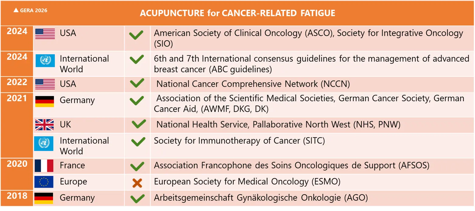 Figure 4. Consensus international sur l'inclusion de l'acupuncture dans la prise en charge de la fatigue liée au cancer (source : Evidence in Acupuncture 2026 [8]). ✓ L'acupuncture option thérapeutique. ✕ l'acupuncture non recommandée.