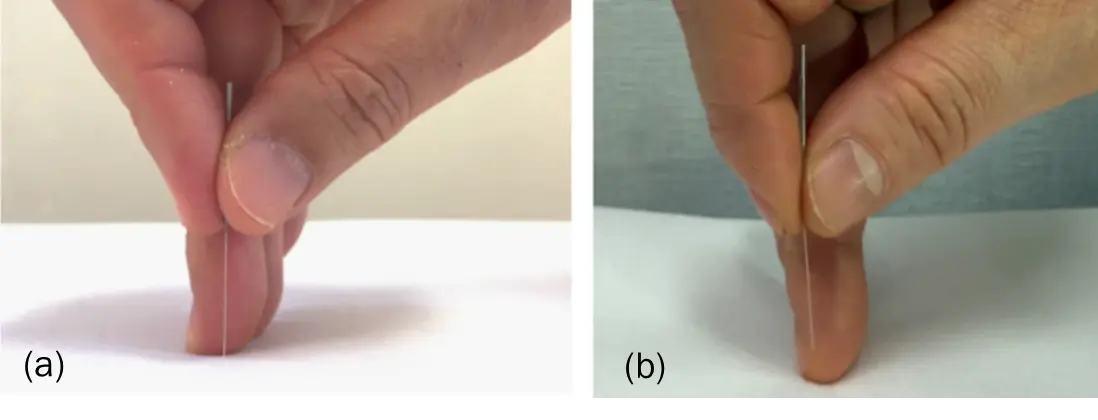 Figure 2. (a) Technique d’acupuncture par simple contact (CNT) ; (b) fausse CNT, absence de contact de l’aiguille avec la peau (d’après Ogawa-Ochiai K et al., 2026).