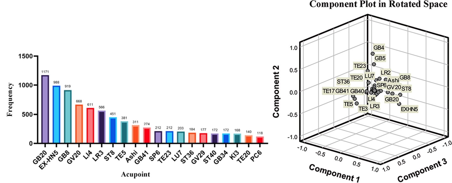 L’histogramme de gauche présente la fréquence d’utilisation des points d’acupuncture rapportés dans les études cliniques sur la migraine. La figure de droite en propose une représentation par analyse en composantes principales (PCA, principal component analysis) construite à partir des co-occurrences des points au sein des prescriptions : les points proches sont fréquemment utilisés ensemble, tandis que les points éloignés correspondent à des associations plus rares ou spécifiques.