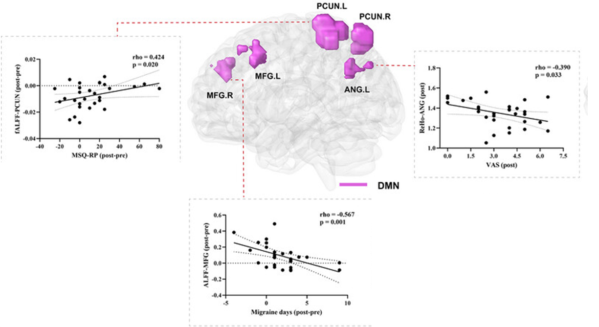 Figure 2. Corrélations entre les variations d’activité de régions du réseau du mode par défaut et les changements cliniques chez des patients migraineux (Xie et al., 2025).