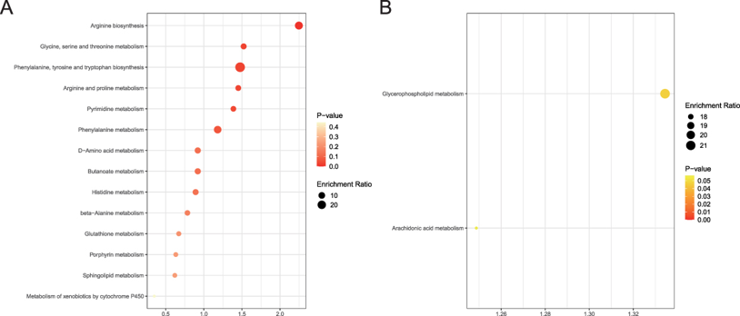 Les voies métaboliques significativement enrichies (p < 0,05) sont présentées pour le groupe acupuncture réelle (A) et le groupe acupuncture simulée (B), selon l’analyse Kyoto Encyclopedia of Genes and Genomes (KEGG). Dans le groupe acupuncture réelle, les voies enrichies concernent principalement le métabolisme des acides aminés et des nucléotides, tandis que dans le groupe acupuncture simulée, les enrichissements observés sont essentiellement liés au métabolisme lipidique.