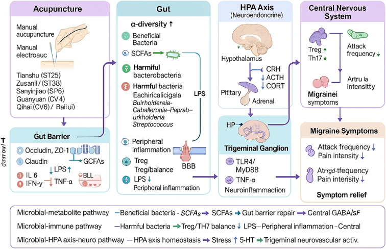 Zhong J, Liu X, Zhu H, Zhang C, Guan R. Gut microbiota in the treatment of migraine with acupuncture: a review. Pain Ther. 2025. Nov 10. https://doi.org/10.1007/s40122-025-00793-9