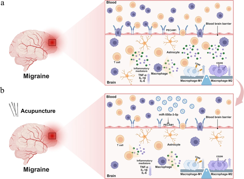 (a) Migraine : expression élevée de PECAM1 au niveau endothélial, migration accrue des monocytes à travers la barrière hémato-encéphalique, activation gliale et neuro-inflammation. (b) Après acupuncture : augmentation de miR-550a-3-5p, diminution de l’expression de PECAM1, réduction de la migration monocytaire, atténuation de l’activation gliale et de la neuro-inflammation.