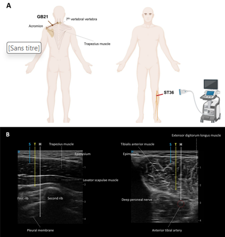 (A) 21VB et 36E. (B) Images échographiques illustrant, pour chaque point, les trois niveaux de profondeur considérés : S (niveau superficiel, correspondant à la distance peau–épimysium), T (profondeur de deqi, correspondant au niveau de perception d’un deqi jugé adéquat par le sujet) et H (niveau profond critique : plèvre pour le 21VB et artère tibiale antérieure ou nerf fibulaire profond pour le 36E).