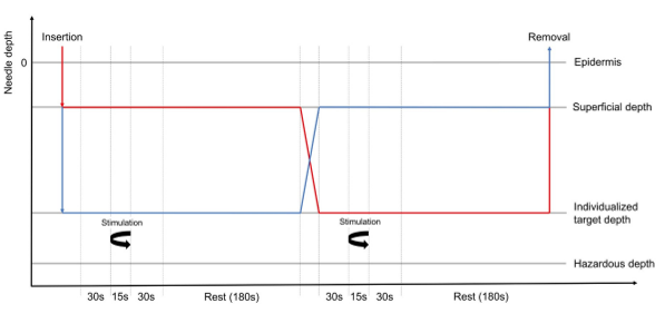 A chaque session, une aiguille était insérée puis ajustée à la profondeur prescrite. Cette phase était suivie d’un repos de 30 secondes, d’une stimulation de l’aiguille pendant 15 secondes, puis d’un nouveau repos durant lequel les participants évaluaient leurs sensations de deqi à l’aide du questionnaire MASS. La ligne rouge représente la transition du niveau superficiel vers la profondeur de deqi (condition expérimentale 1), tandis que la ligne bleue représente la séquence inverse (condition expérimentale 2).