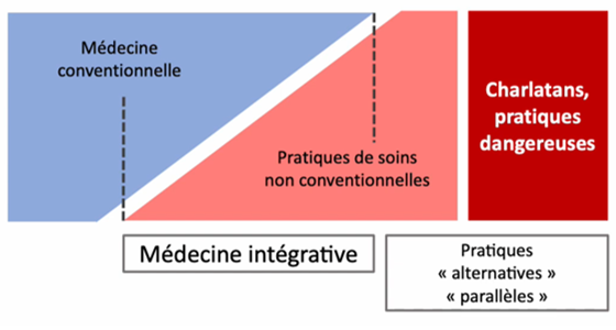 Le deuxième schéma matérialise la zone grise en introduisant la catégorie de « médecine intégrative », distincte des pratiques dites "alternatives" ou "parallèles", au sein desquelles sont situées les pratiques charlatanesques ou dangereuses. Les frontières sont marquées par des pointillés, mais la nature des critères de distinction — d’un côté avec la médecine conventionnelle et de l’autre avec les pratiques alternatives — n'est jamais explicitée. Cette indétermination rend manifeste une asymétrie : la frontière gauche, au contact de la médecine conventionnelle, est fixe et hermétique, la frontière droite, au contact des pratiques alternatives, est mobile et poreuse, permettant d'installer dans l'espace intégratif toute pratique selon les contextes et les intérêts en présence. Cette configuration ne clarifie pas le débat : elle laisse intacts les termes de la controverse.