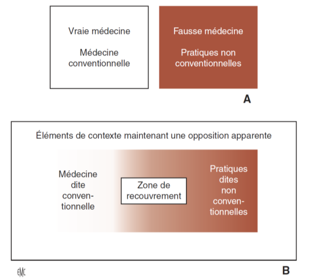 À l’opposition binaire « vraie médecine – fausse médecine » mise en avant par la mouvance NoFakeMed (schéma 1A), le CUMIC substitue une représentation dite « complexe », organisée autour d’une zone de recouvrement (schéma 1B), identifiée comme l’espace de la « médecine intégrative » (schéma 2).
