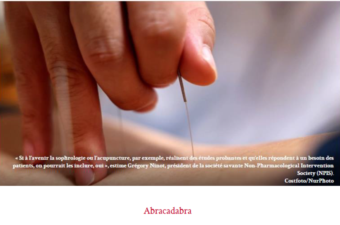 Publié le 9 octobre 2025, l’article de L’Express signé Stéphanie Benz et intitulé « Mélange des genres. L’encombrant réseau du Pr Grégory Ninot » [4] examine les zones d’ombre entourant la Non-Pharmacological Intervention Society (NPIS) dont l'objet sont les INM (interventions non médicamenteuses), fondée et présidée par le professeur Grégory Ninot, de l'Université de Montpellier. Sur le site internet du journal, l'article est présenté sous un autre titre : "L’encombrant réseau du Pr Grégory Ninot, le scientifique qui prétend évaluer les médecines douces" [4].