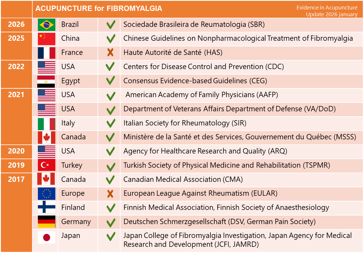 En 2025, la Haute Autorité de santé (HAS) a publié ses recommandations de bonne pratique (RBP) consacrée à la fibromyalgie qui ne préconisent pas l'acupuncture. Cette position est notable car elle apparaît discordante au regard des recommandations internationales récentes, qui toutes, depuis 2019, incluent l’acupuncture comme option thérapeutique (voir encadré 4).