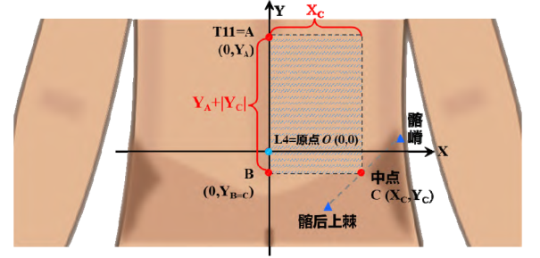 Le panneau A définit la zone lombaire explorée, délimitée par les repères anatomiques T11 (A), L5 (B) et l’épine iliaque postéro-supérieure droite (C). Le système de coordonnées cartésiennes utilisé pour l’analyse spatiale est représenté, avec une origine (O) fixée au niveau du processus épineux de L4. Ce repère permet d’exprimer la position spatiale des points testés.