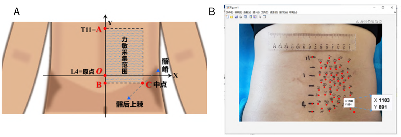 - Repérage photographique et extraction spatiale. À l’issue du recueil, une photographie standardisée de la région lombaire était réalisée en vue verticale (figure 2B). Les positions des points testés ainsi que de sept points d'acupuncture de référence (du 20V au 26V) étaient repérées, puis leurs coordonnées spatiales extraites à partir des images à l’aide du logiciel Matlab, en vue de l’analyse ultérieure.