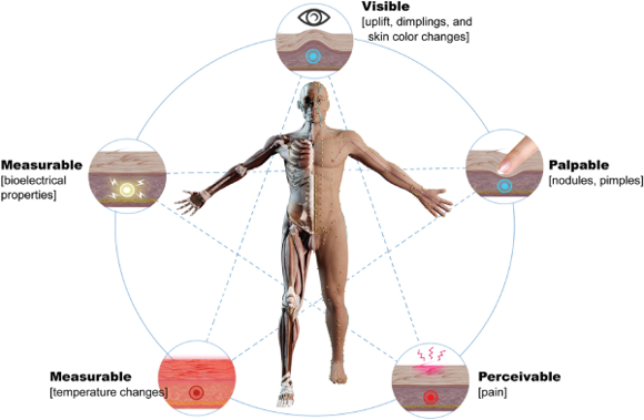 - les modalités de la réactivité des points, qui englobent une sensibilité mécanique et thermique accrues, ainsi que des modifications locales biophysiques (variations de la température cutanée, de la résistance ou de l’impédance électrique, de la perfusion microcirculatoire, ou de paramètres acoustiques ou infrarouges) ou morphologiques (nodules, cordons palpables, indurations) ;
